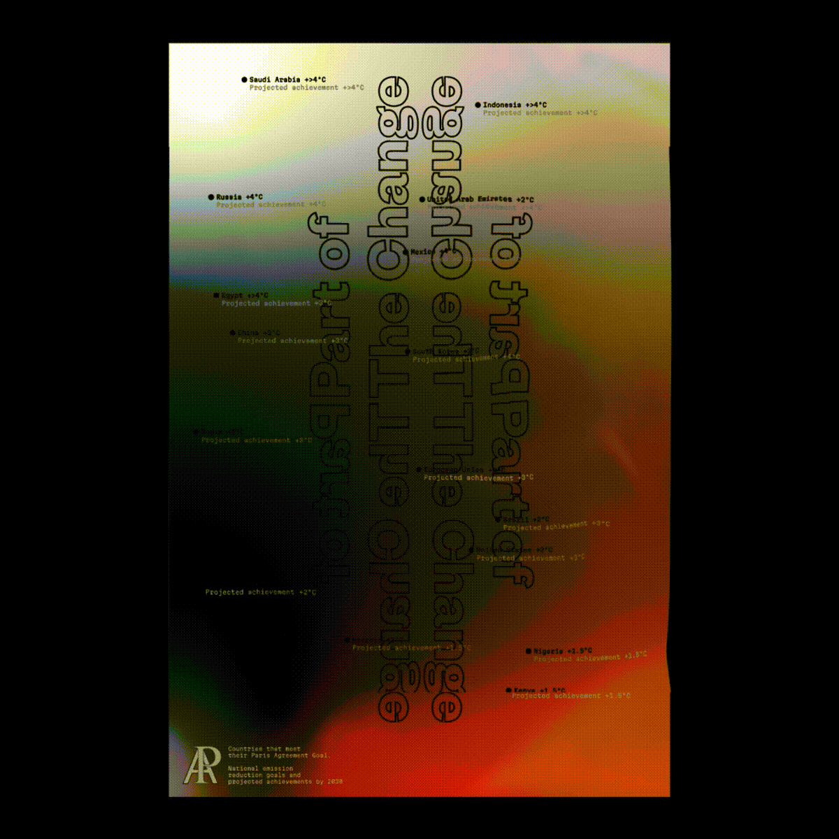 VAiF is the Visual Arts International Festival that is taking place in Thessaloniki this November, promoting visual and graphic arts. Our poster for the festival’s open call with the theme “Designing for Change: Earth”, was based on the statistics of countries, based on their National Emission Reduction Goals, with the intention of meeting the Paris Agreement Goal. The design mixes the stagnant nature of typography referring to metrics and the gradient, fluid levels of colour, transcending between warm and cool tones, highlighting the contrast between the two. Measures and objects of measuring. The intention is to elevate the fluid value of culture in progress, rather than just metrics, to make impactful change.