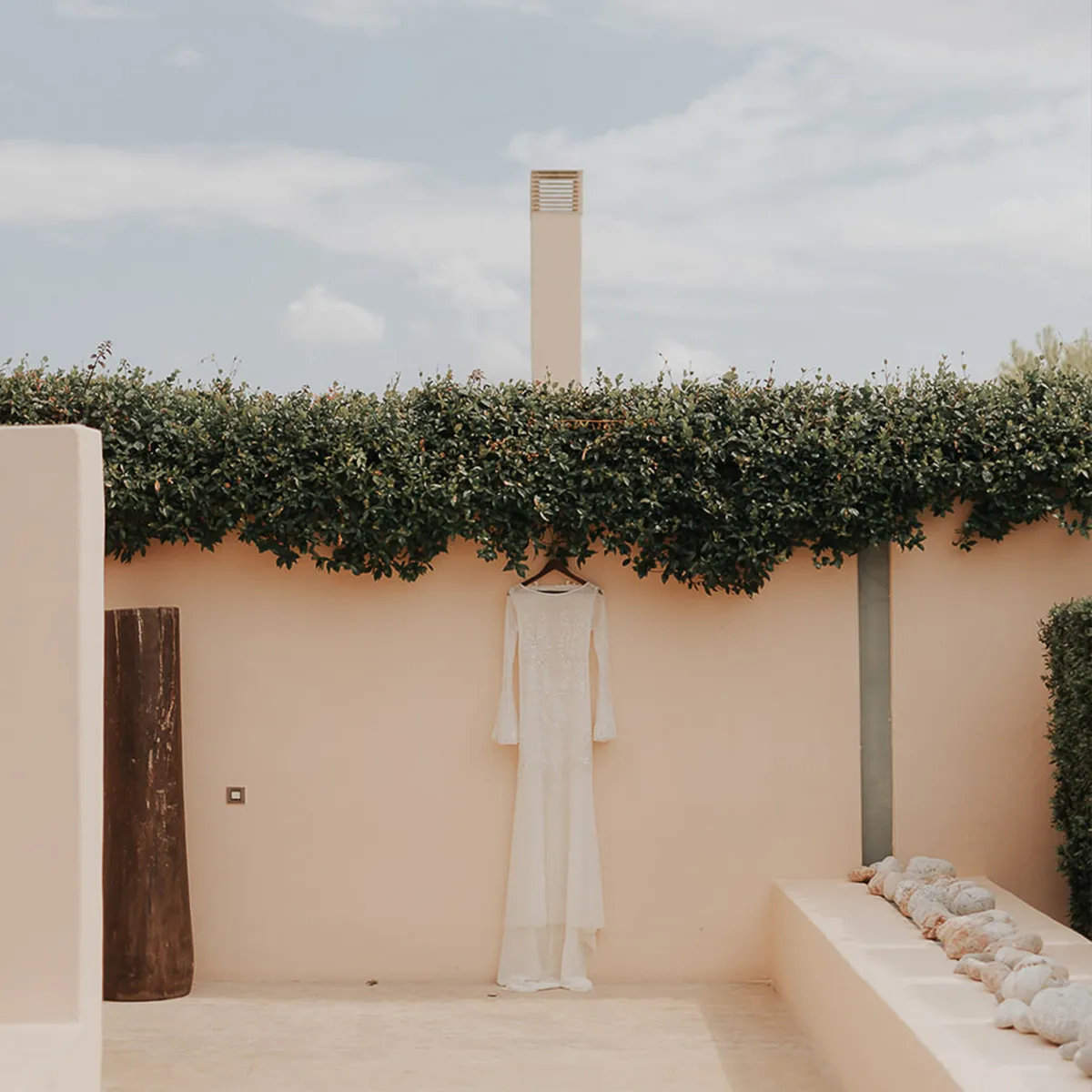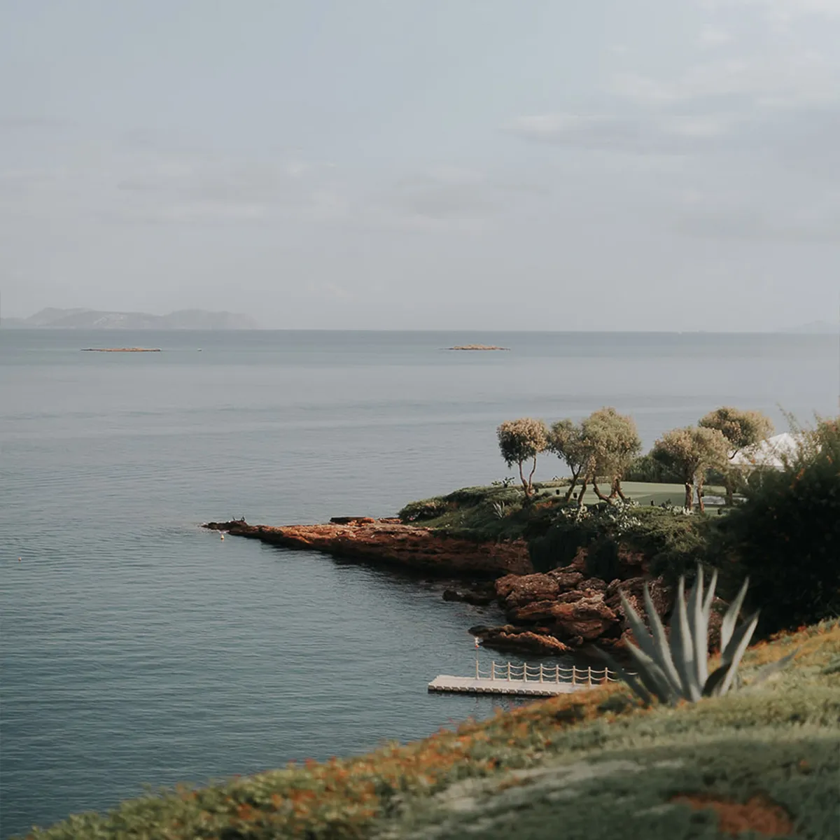 Reaching that majestic sunset hour, the entire property was transformed, overlooking the pool and the ocean landscape. A picturesque floral arch marked the scenery, with flowers arranged in a somewhat untidy manner that mirrored the natural beauty of the surroundings. Chamomile and eucalyptus set the tone for the floral language of the occasion; soft but refined.